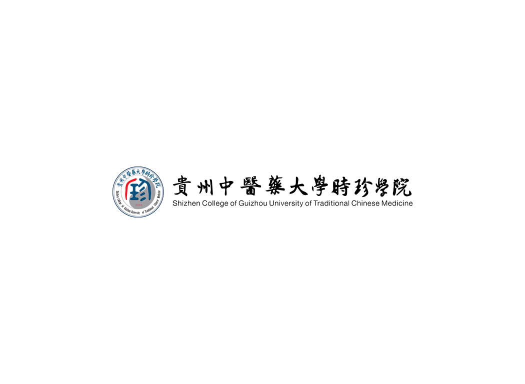 贵州中医药大学时珍学院校徽呈圆形构图;主体图案以学校名称“时珍”的“珍”字篆书作为元素,寓意中医药是华夏的“珍宝”;主体图案下方“2001”为学校创办时间;圆形图案上下方分别由学校中英文名称环绕。