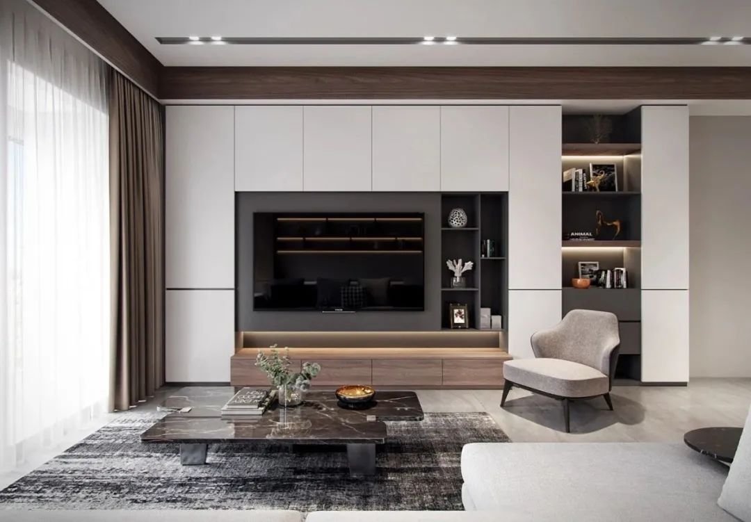 如果对空间有储物或展示需求,隐藏式柜体+展示柜+电视的组合搭配,可以让整面墙看起来更“整齐划一”,非常有品位。