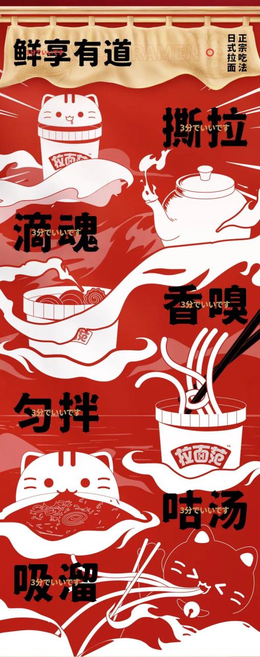 这是一款日式拉面详情页设计,细看详情页设计需要插画、3D、平面多个技能,应该是几个设计师完成,推荐大家欣赏学习。不得不说,看完这个详情页的设计之后瞬间饿了。每一屏都很精彩,动式面条,食欲十足,底部还有几张场景插图,相映成趣。