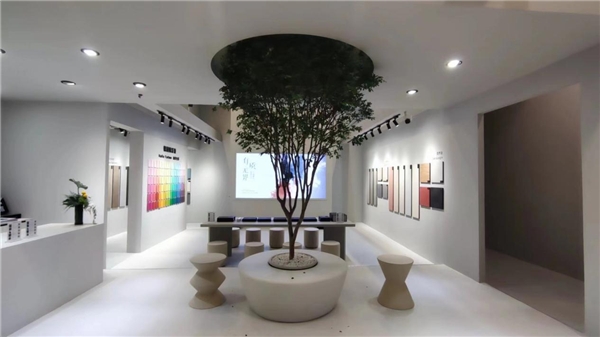 步入展厅,可以全方位感受到美末色彩与质感交织的艺术魅力。简单纯粹的壁材打造出的高雅的气质与柔和的氛围,不需要过多繁复,优雅便浑然天成。当材质成为主角,自然、生活、艺术也成为整个展厅的视觉符号,美末MODAMURI旗下产品糅合进高级且纯粹的整体色调中,用材质的细腻诠释了生活的惬意与舒适。中央一棵与天相接的嘉宝果树牢牢占据视野中心,根植于由微水泥打造的艺术座椅中,自然气息与层次丰富的质感在展区交织展开。