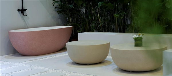半墙下的休闲区是展厅设计的亮点,如同一个室内庭院,大型绿植置于其间,一侧微水泥覆盖的浴缸与线条极简的桌椅在绿意的映衬下更显静谧,如同穿梭在自然的艺术境界里。前台有免费提供给游览观众的意式咖啡和甜点,咖啡香气萦绕在整个空间内,视觉与感官上的生活美学氛围感也同步拉满。